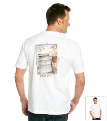 T-Shirts. The King of the Grill always needs his two beauties close by. Pin-up girl meets pin-up grill on the ultra-comfortable Tommy Bahama Men's White "Pin Up Grill" Short Sleeve Screen Tee. This extremely soft tee features a classic short sleeve cut, a tagless collar for a more comfortable wear, the Tommy Bahama logo on the front chest, and an image of the beauty of the BBQ next to the grill. White 100% Cotton Machine wash Imported